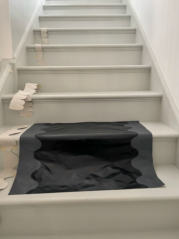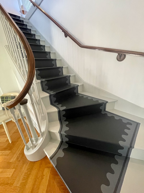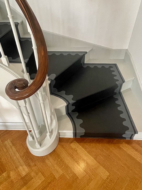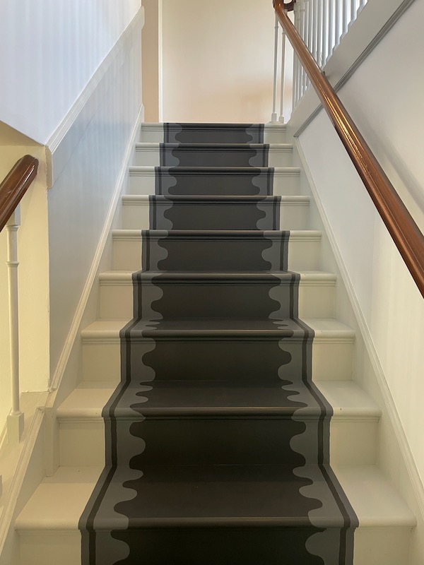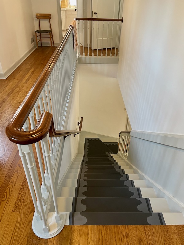 You can see there is a little change in the width of the stairs about half-way down. On the left side of the photo below. Dealing with that small change was a challenge. I ended up drawing a diagonal line from the top to the bottom to resolve the issue. So the space on the outside of the the painted rug is not actually even but because it’s gradual I don’t think it’s noticeable.