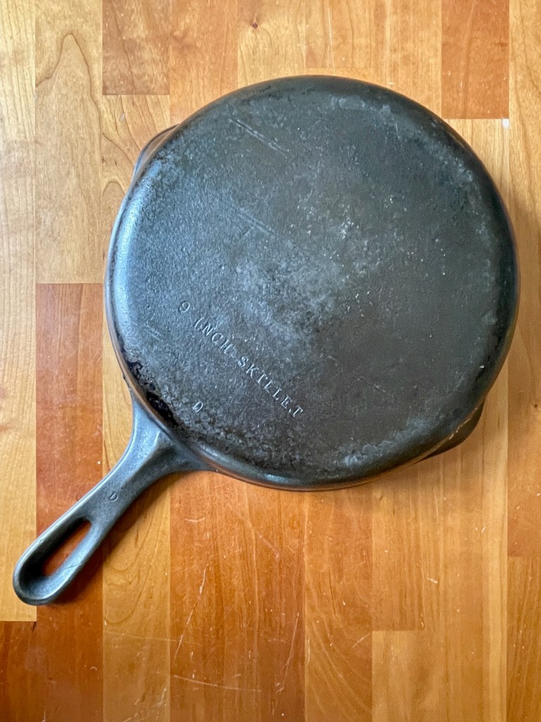 I have a couple cast iron skillets but they are quite big. Plus, I’ve wanted to try a vintage one because I’ve heard they are so nice. I learned that this is an unmarked Wagner skillet. A very common but quality brand – Identifiable by the typewriter style font on the back. I also learned that old cast iron is much lighter than new cast iron. I cleaned it and seasoned it and then used it to cooked some onions last night. The photo doesn’t really show it well but it is very smooth inside. It might be my new favorite pan.