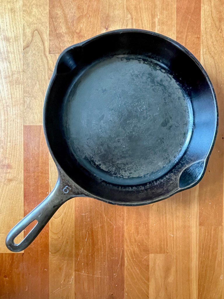 A cast iron skillet: