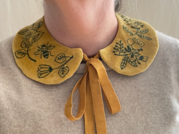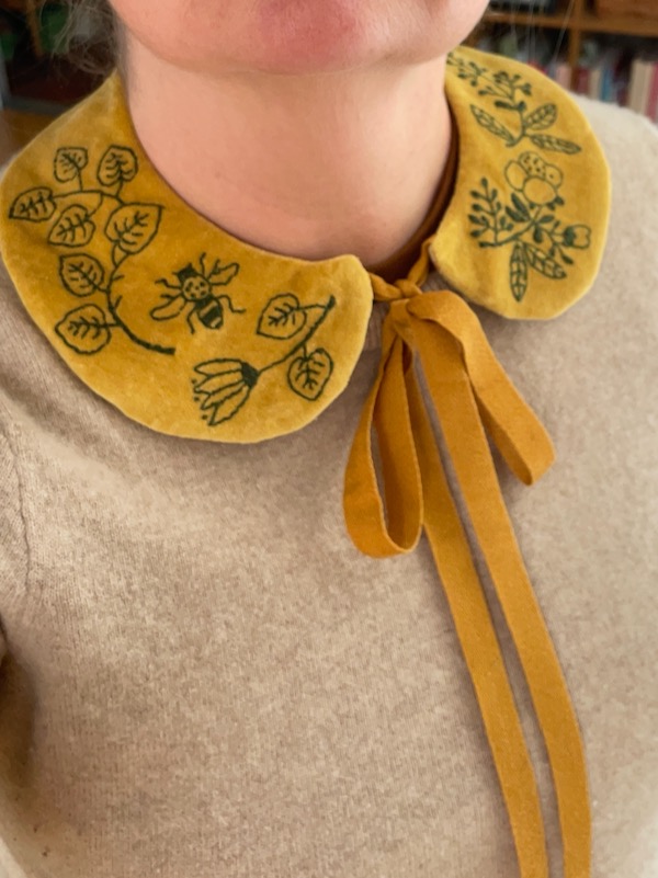 Lastly, I just finished a decorative collar today. I used some velvet-like fabric – actually a pillow cover from IKEA. I spent a couple days embroidering and I think it turned out cute. A fun accessory – an alternative to a necklace.