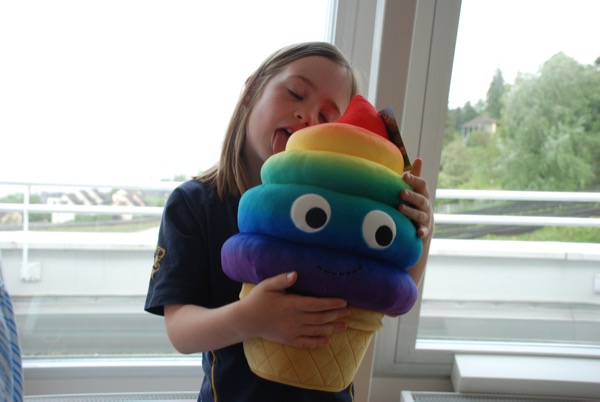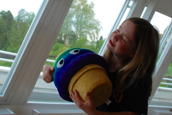 Our funny, freckled, spark of a girl just turned eight. Here she is blowing out her candles and loving her new ice cream softie.